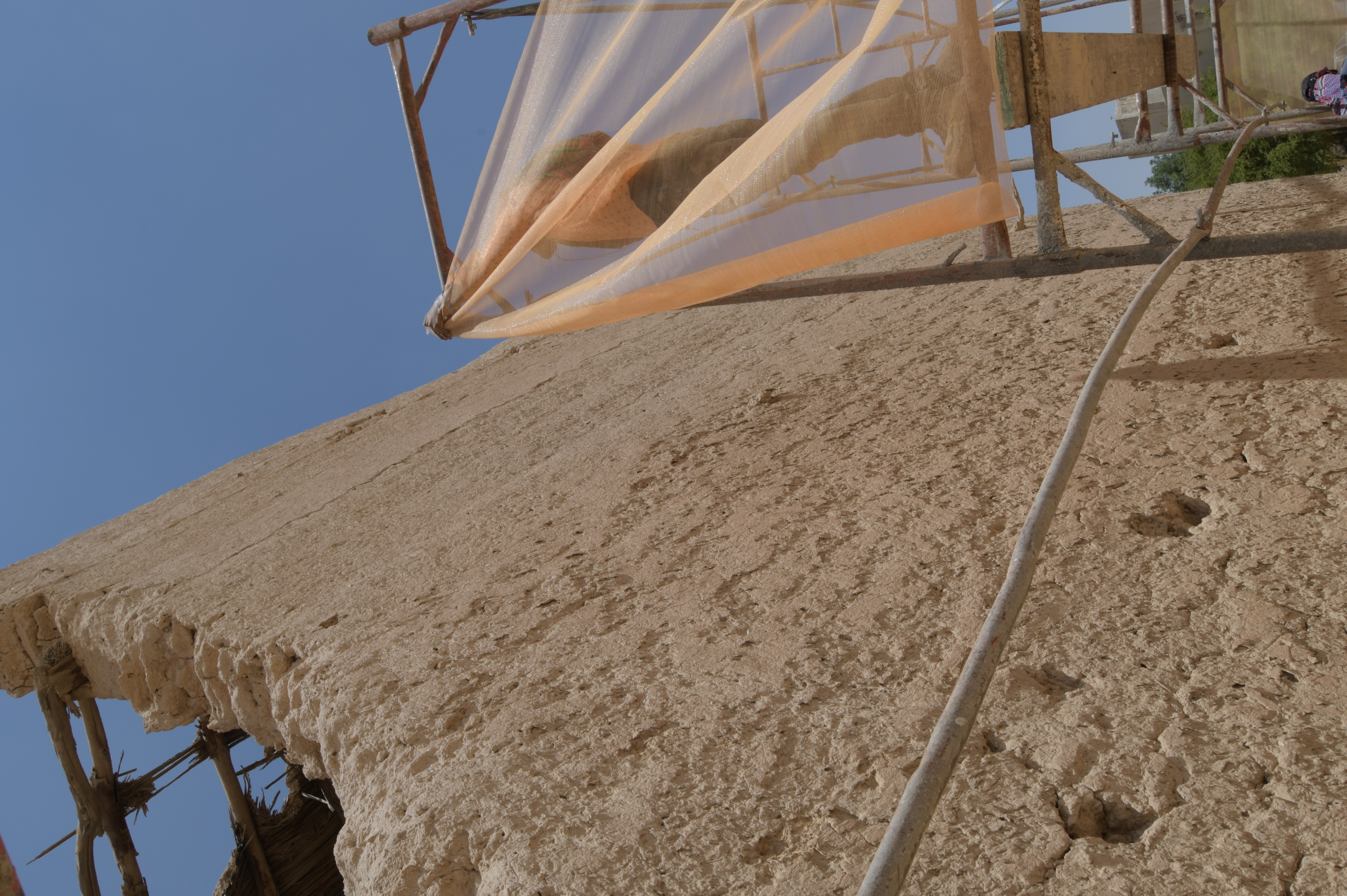 The intervention consists of a fabric cladded membrane that shelters the adobe structure and its existing condition. The installation falls short under the prerequisite for a formal restoration, and therefore does not touch the existing structure.